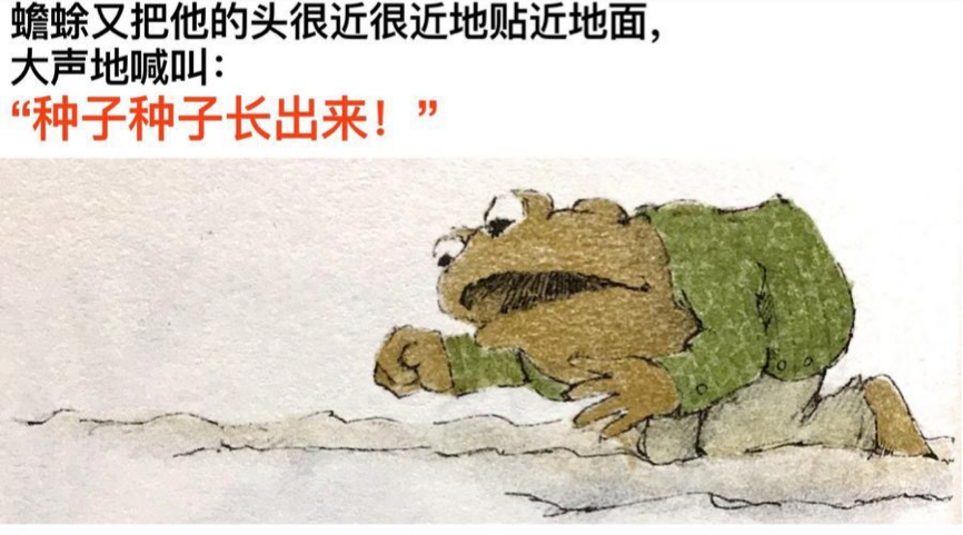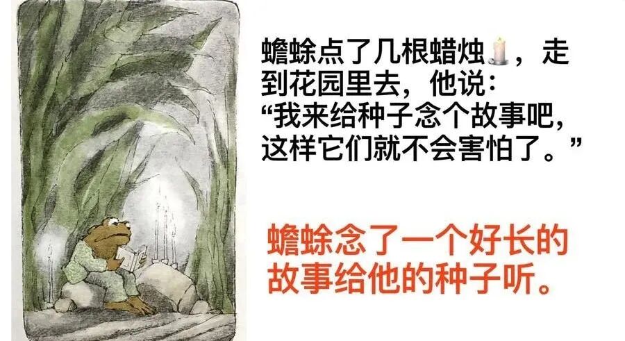 可是蟾蜍也有温柔的时候,他担心种子在黑夜里害怕,于是点上蜡烛给种子读了好长时间的书,还给种子唱歌、演奏小提琴……我问孩子们,一个人能既急躁又温柔吗?小朋友用眼睛告诉我们‘是的,可以’。”