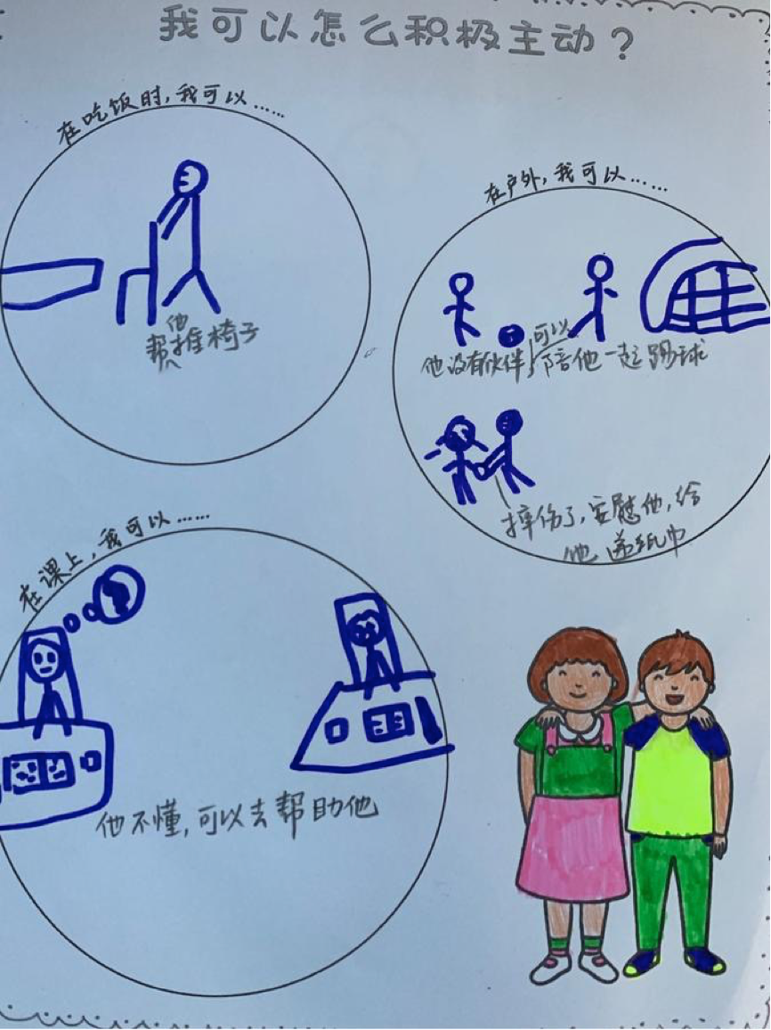 接下来,孩子完成了“我想交什么样的朋友”的小任务,分享发现,有的同学喜欢和自己一样的朋友,有的同学喜欢和自己不一样的朋友……那第三步呢?什么叫积极主动呢?在学校什么时候可以跟她积极主动呢?接着,我们完成了《我可以怎么积极主动?》的任务单,思考在吃饭时、在户外、在课上,你可以怎么积极主动,对朋友做一些事情。