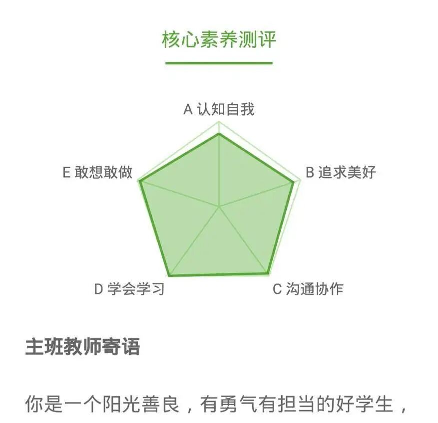 来回又把报告多读了两遍,清晰的看到,核心素养测评图上,五个维度:自我认知、追求美好、沟通协作、学会学习、敢想敢做,每个维度下的分项评估图,不规则图多,孩子短板就多。