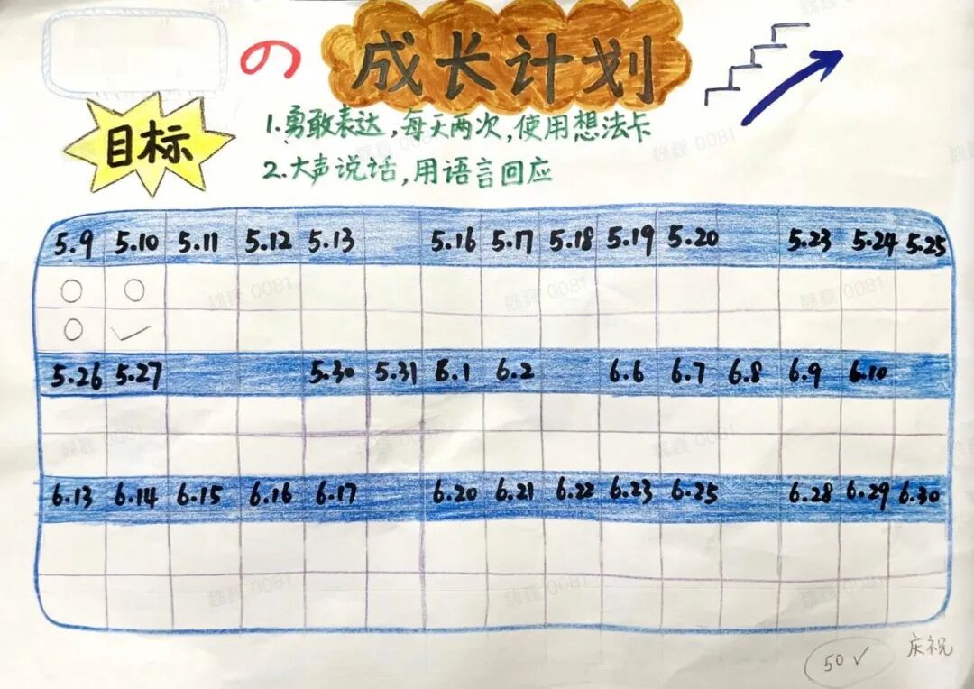 岳岳(代名)妈妈,约谈后的那一周我找岳岳聊了聊。首先和他一起细数了他从上个学期到这个学期的进步,肯定他的努力和成长:1. 跟同学玩得更好了,有很多的互动,说话也更大声了。2. 宿舍午休情况很好,能安静入睡,大部分时间还睡得很好。然后再让他自己说说他觉得还有哪些方面可以继续改进的时候,他表示不知道,于是我直接跟孩子说了老师们的期望–希望他在课堂上能够更加积极参与、勇敢表达,因为如果总是不表达老师就不知道岳岳是否听到了,听懂了。孩子自己也表示有时候是有想法的,也想让自己的想法被别人听见,只是不太敢说。所以我跟孩子约定今后有任何想法,都可以使用想法卡提示老师,这样老师就可以叫岳岳回答,创造机会让岳岳的想法也被其他同学听见。并且,岳岳这次在跟我聊的时候,声音也依然比较小,经常需要长时间思考。所以在过程中,我也提出了老师们的另一个期望–大声说话,用语言回应他人。最后,我们总结了这次短暂的谈话的结果,制定了岳岳的成长目标计划:基于这些讨论,我给他画了一张简单的海报,以便帮助他去记录自己每天的成长。初期可能经常会忘记,所以我每天会鼓励岳岳举手(使用想法卡)也提醒他记录,每天发表一次想法就可以在成长计划表上打一个✅,如果✅数量达到了50,就意味着这两个目标基本达成了。达成目标后可以有一个庆祝仪式,但他自己还没想好要怎么庆祝。我昨天提醒他晚上可以和爸爸妈妈讨论,但今天他说忘记了。今天下午的项目课上,岳岳就用比较大的音量发言了。我也及时给他点赞,鼓励他迈出了第一步。这两周我会经常提醒他并且跟进他的目标完成情况,希望他养成习惯后可以自己去记录自己的进步,直到不再需要记录。爸爸妈妈在家也希望可以继续坚持上次我们达成的共识:把岳岳当成一个一年级的孩子而不是幼儿宝宝,逐渐放手让他自己去表达、体验和实践。对于他力所能及的事情,爸爸妈妈可以慢慢尝试交给他,让他多表达一些,多做一些。也期待你们可以更多地给我们反馈岳岳在家的进步呀~