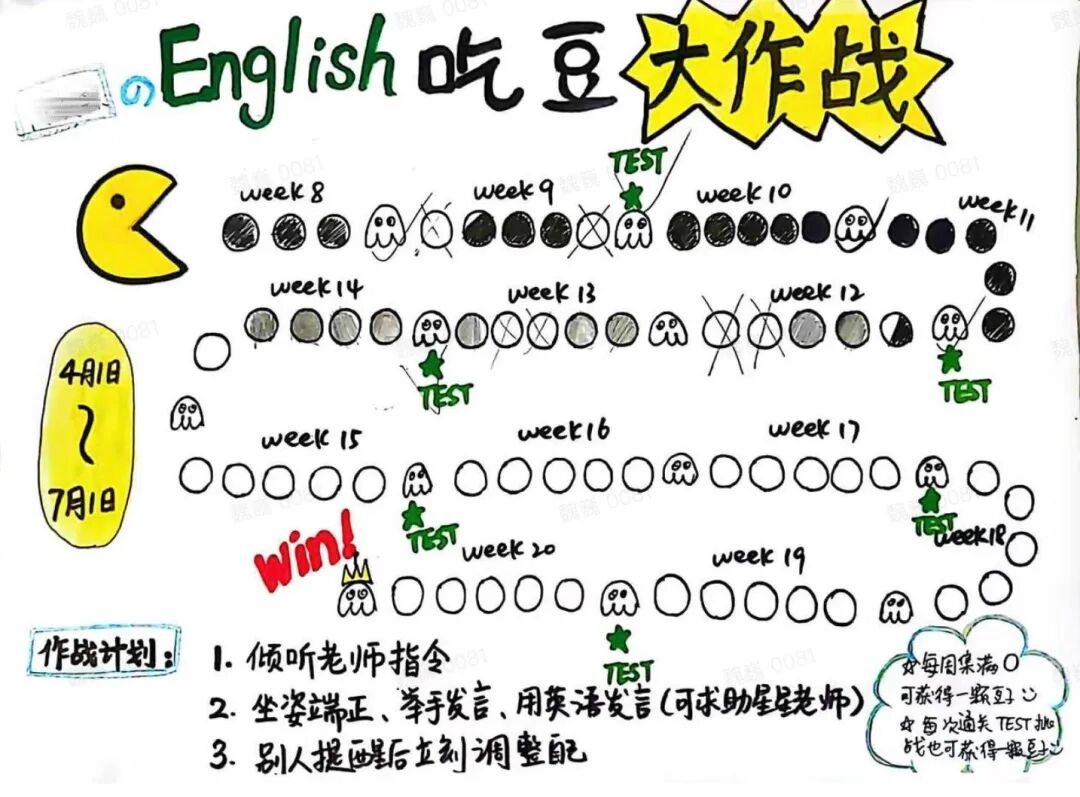 5.将激励体系可视化并定期与孩子检查进度,通过具体的正反馈强化正面行为关于英语课的部分,上次我们约谈结束后,我和星星老师也找跃跃(代名)单独就英语课的问题进行了计划,在这里也把我们达成的共识分享给爸爸妈妈:1. 首先我让跃跃自己对英语课表现进行了自评,他自己认为是five(满分10分),也很认同自己还有很大的进步空间,同时明确跟我表示他也想学好英语。我和星星老师也跟跃跃肯定了他目前在英语方面的潜力和水平,希望能给到他学习和挑战的信心。2. 接着我们一起讨论了英语课上应该遵守的课堂规则,他自己说要做到:倾听星星老师和外教老师的指令;举手发言、用英语表达;别人提醒后立刻调整自己,我们一致认为他可以做到,他也觉得自己能够做到。3. 课堂上遇到不懂的部分可以及时求助星星老师,所以跃跃也接受星星老师坐在离他比较近的地方,以便能够及时地给他帮助。4. 最后,我们约定每天如果能够遵守英语课堂规则,就能学到并积累更多的知识,然后我们每两周会由星星老师制作专门的英语通关小挑战来帮助跃跃自查英语学习情况。所以我帮他画了一张海报,方便我们及时跟进跃跃的英语课学习状态。因为最近比较忙,所以昨晚才画完,还没来得及给跃跃看,但他知道这个海报的存在。我会给他复印一份这个海报,一份放在家里,一份放在学校,方便家校同步跟进。在此基础上老师们商量着,如果一周的英语课跃跃都能做到遵守课堂规则,则可获得一颗豆子;每通过一次通关挑战也可以获得一颗豆子,以作为英语大作战的激励。希望通过这样的个性化支持方案和激励方案,通过持续跟进,能帮助跃跃在英语课上有所收获。后面我们持续保持沟通哈~关于英语课的部分,上次我们约谈结束后,我和星星老师也找跃跃单独就英语课的问题进行了计划,在这里也把我们达成的共识分享给爸爸妈妈:真心希望,我们成年人走了那么多年才意识到最重要的人生底层逻辑,能够不留遗憾地在童年与少年也被用心地搭建。无论是聪明还是内敛的孩子,无论是审慎还是活泼的孩子,都能被充分看到,感受到身边的人对自己的欣赏,悦纳自己,在徘徊与迷茫的时候被一双手稳稳地托着,带着饱满的勇气独自走向人生的重重挑战。