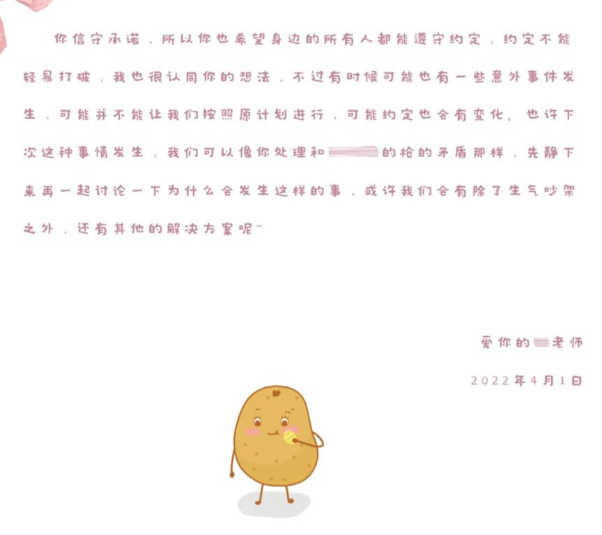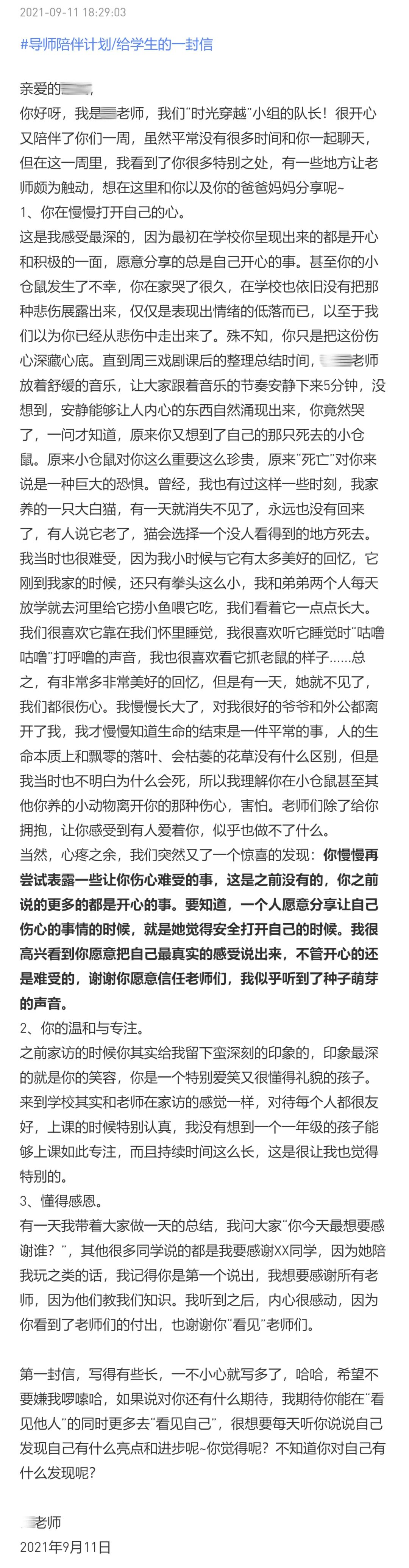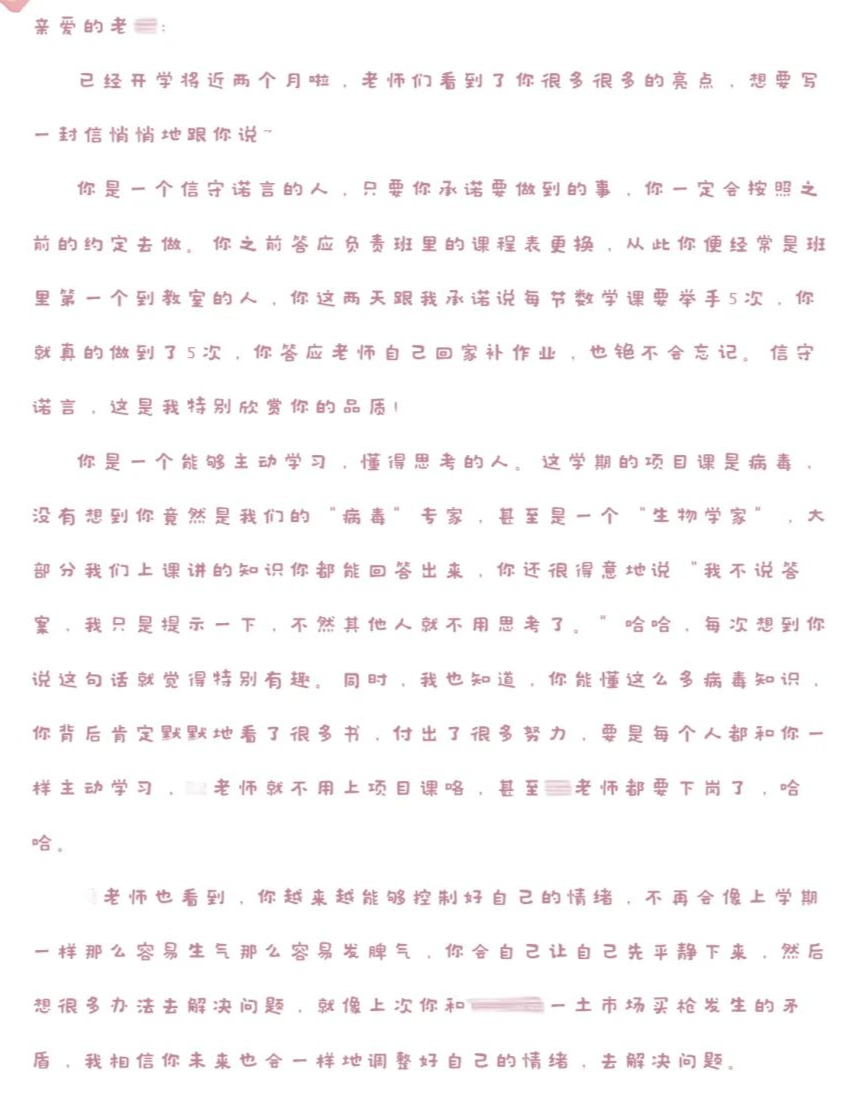 即使很多优秀教师深知“以学生为中心的课堂”在教学上对孩子起到的深远影响,但在主流的“大学校”里,普遍一个班有4、50个孩子,老师大量精力还会被行政工作牵涉,在这种情况下,孩子在课堂上进行探索式学习的比例和提升底层核心素养的机会能有多少?每位学生的个性与独特性能否被照顾到?虽然家长们普遍默认学校是教孩子知识和技能的地方,学科教学也无疑是目前很多学校都放在第一排序的重点,但我们更想先讲一讲孩子的“社会情感学习”,即Social Emotional Learning (SEL)。如果我们回看自己的人生,在我们的学生时代,和学科知识比起来,社会情感学习塑造的性格力量,是不是意义和影响更大呢?让我们来看看广州一土的小土豆们的一年级都收到了什么情感电波,我们的老师是怎么真正“看见”每一个孩子的。 看见每个孩子,不是泛泛的夸,而是要提高正面反馈的颗粒度 一年级的小土豆也会有自己的导师,专属于每个班的语文/数学/助教三位老师会各自带5-8名学生。每天放学后的导师小组活动和一对一约谈时间,都是导师与导生深度交流的机会。在一土一年级的孩子哪怕还没认识很多字,导师也会认真的给孩子们写一封封包含情感的长信!这些信会在很有仪式感的班会中交到孩子手上,孩子的成长需要被充分看见与反馈,他们也会体会到,如果人人的爱意都可以充分表达是多么美好!北京一土校长小月校长常常说,在看见孩子的反馈中,请爸爸妈妈提高反馈的颗粒度,要从具体事例出发,真诚详尽地传达自己的感受,肯定TA的态度与努力而非天份,你用心的话语孩子一定会懂。