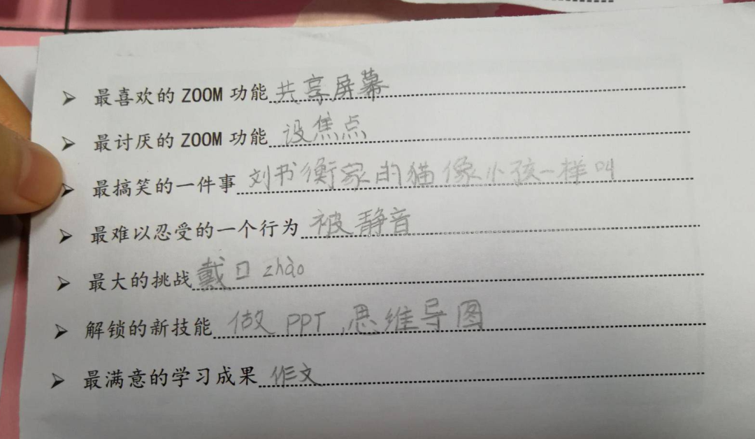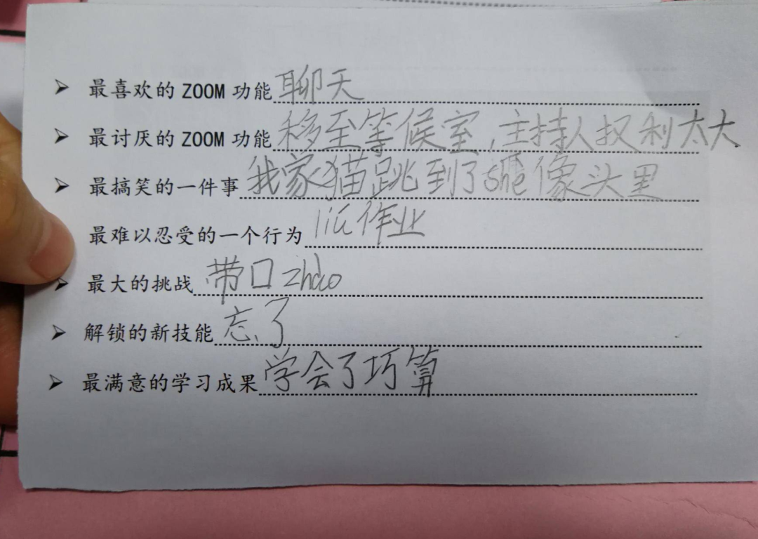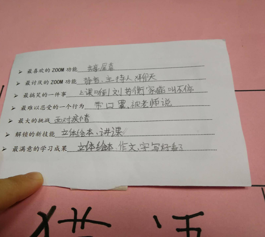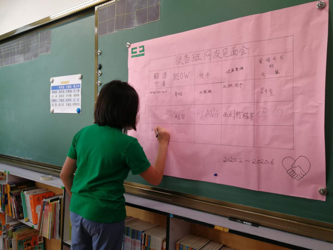 四年级的孩子则是来了一场线下“团建”、在网友见面会的海报背面,写满了孩子们在线上学习中各种有意思的小感悟。