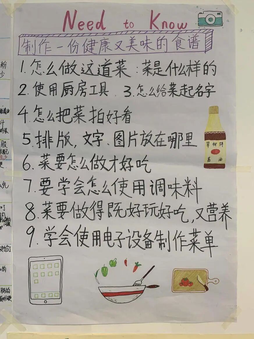 虽然知道最后要做菜谱,但是菜谱应该是什么样的?学生们通过观察分析老师提供的High Tech High学校(美国著名的以PBL教学闻名的中学)的菜谱案例,提炼出了一个好的菜谱应该具备的几大要素:图片,菜名,原料和步骤。那我们需要学习哪些知识和技能把这样的菜谱做出来呢(Need to Know)?孩子们七嘴八舌地讨论出了以下学习目标——