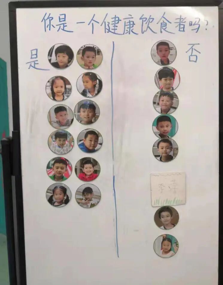 “你是一个健康饮食者吗?”第三次回答,很多孩子都把自己的照片放在了中间(不太确定),因为他们明白了健康饮食其实不简单,需要考虑很多因素,他们知道自己在某些方面没有完全达到要求。当他们把知识与自己的生活建立联结,深度学习已经开始发生。