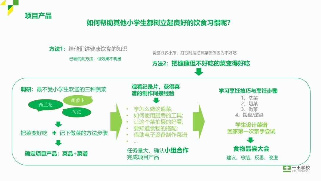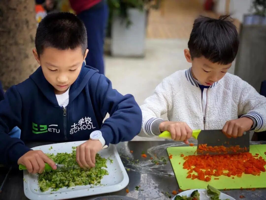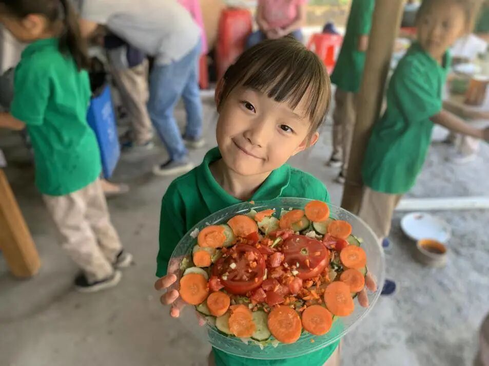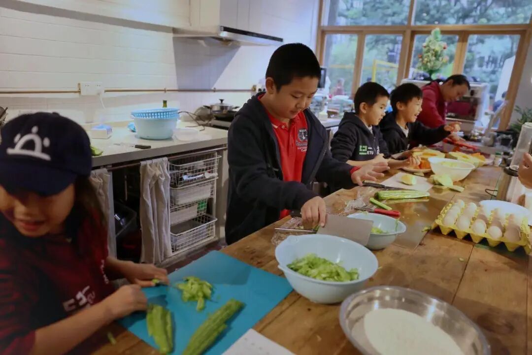 他们按照之前在农场的分组,轻车熟路地操起了菜刀与锅铲,把最“难吃”的三个蔬菜现场改造变身;边做菜,还要边轮流跑到摊位上口水飞溅地兜售自己设计的菜谱书,一声声喊着“我的份额卖完了!”厨房旁边,孩子们自己拍摄剪辑的美食Vlog一个连一个滚动播放,看得一众弟弟妹妹直流口水。还要挤出人手负责给人头攒动的家长们blah blah地讲解整个项目的探究进程。