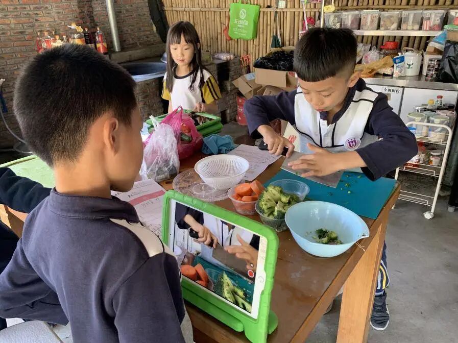 在菜谱里有文就要有图,所以小土豆打算给苦瓜、西兰花和胡萝卜三个主角拍摄创意照,让我们的菜谱更吸引人,同时在平面印刷的菜谱之外把我们做菜的过程做成美食vlog。为了完成创意照和美食vlog,小土豆们非常兴奋地学习了必需的拍照和摄像技术。他们学会了从构图、角度、光线和造型等方面去拍好一张照片,也明确了拍视频过程要关注什么。这就是项目式学习用高阶策略(解决问题)来带动学习的优势——老师在前面引而不需要在后面推。创意喷涌而出,技能悄然内化。