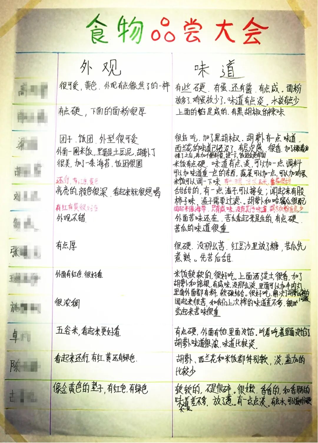 有了Need to Know海报的指引,小土豆们开始分六组分别设计一道菜,并且尝试在家里自己把这道菜做出来并于周一带到学校。为了能够让小土豆们对自己设计的食谱有更客观全面的认识,我们在班里举办了一场隆重的“食物品尝大会”,大家从外观和味道两个角度来评价食物,各小组再根据评价再次迭代菜谱。