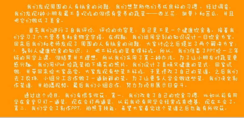 最后,小土豆们写下了做这个菜谱的初衷——“因为我们发现周围有人有挑食的习惯,我们想帮助他们,所以我们做了菜谱。”“因为我们已经把三种不好吃但有营养的蔬菜变好吃了,所以我们把这个菜谱记下来,让别人也知道,这样别人就可以照着做。”爱己,及人,这不正是我们一直所期待的美好品质吗?看小土豆们做到了!他们记录下全班同学的发言放在菜谱前言,看着这么朴实稚嫩的文字,发现不喊口号的他们这么帅,真的在把每一分好奇都幻化为了行动!