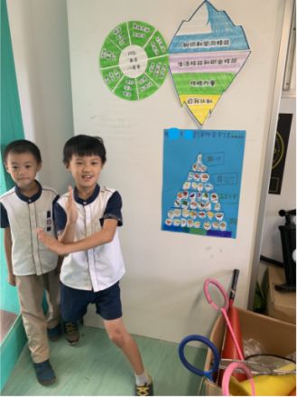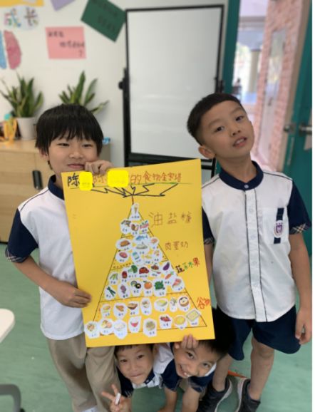 这些孩子们都是经历过三次项目展示日的老手了,马上有同学提议做健康饮食的海报,让全校的老师和同学都能学习到这些健康饮食知识!于是一天后,一、三年级和老师办公室的各个角落就贴满了翠柳班小土豆们精心制作的“食物金字塔”。