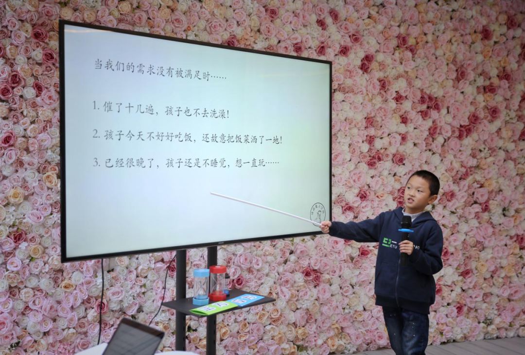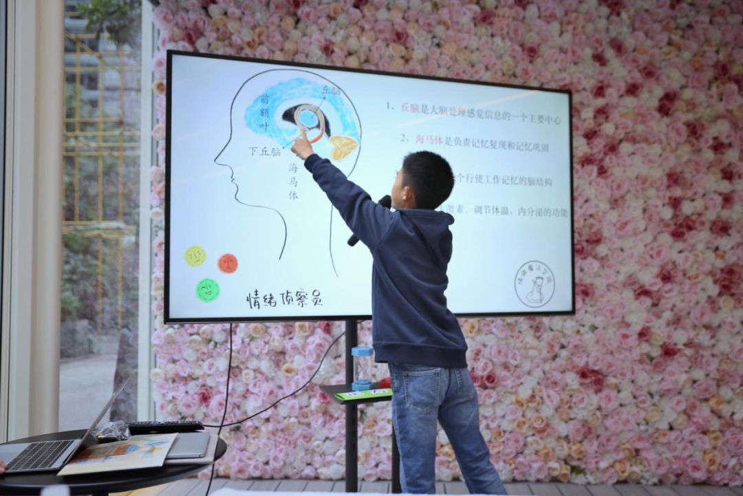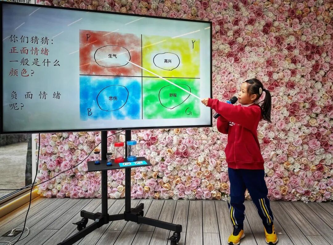 三年级的孩子在自己的摊位上把一本情绪项目手册为不同的人讲了数遍,每遍都足足要讲五分钟以上,口干舌燥的他们又要迅速赶到讲座室迎接重头戏——情绪工作坊。他们化身小老师,底下是分好组、拿到闯关任务卡的家长们,以及黑压压站在后面蹭课的陌生人。他们轮流独立上台、拿着话筒与教鞭,讲解、提问、评点、互动、总结,行云流水,干脆利落。一屋子的大人被这一队9岁孩子的落落大方都镇住了,在小老师的引导下一关关地学习情绪的知识。这些孩子并非个个口才逆天的学霸,只是这些内容自己经过一学期的主动深度学习,记住了、相信了、内化了。