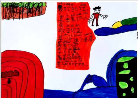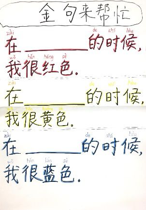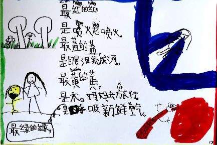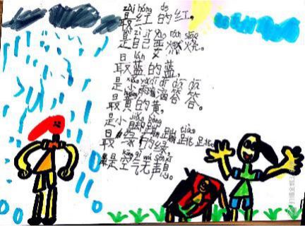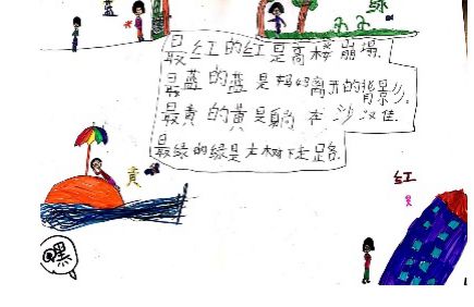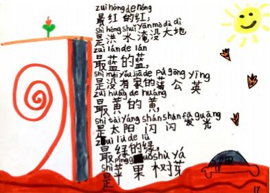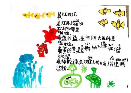 其次,当我是红黄蓝绿颜色的时候,我的具体感受是什么?我们一起读了很多的情绪绘本,去感受和体悟每种情绪的样子,最后每个小土豆都写了一首关于自己的情绪感受的小诗。这些一年级刚刚入学的孩子,每人用最最真实与浓郁的表达,肆意地倾诉内心的情感。连一众文艺青年出身的老师看着孩子们纯真浪漫的诗句都自叹不如——“最蓝的蓝,是小河掉入悬崖”、“最蓝的蓝,是没有家的蒲公英”、“最蓝的蓝,是妈妈离开的背影”……
