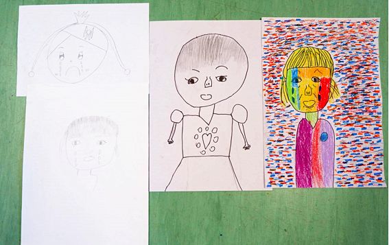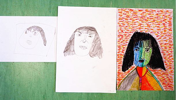 最后,当我很红黄蓝绿黑色的时候,我的表情又是什么样子的?每个小土豆摆出自己最强烈的情绪表情,用iPad自拍,并对照着完成了一幅自己的情绪肖像画。在一土,项目产品讲究迭代,这幅情绪肖像画,孩子们有1.0 /2.0/ 3.0各个版本,其间也是经历了每个人彼此的画廊漫步+反馈,不和别人比,就和自己比,浸润在自己情绪世界里全力以赴!