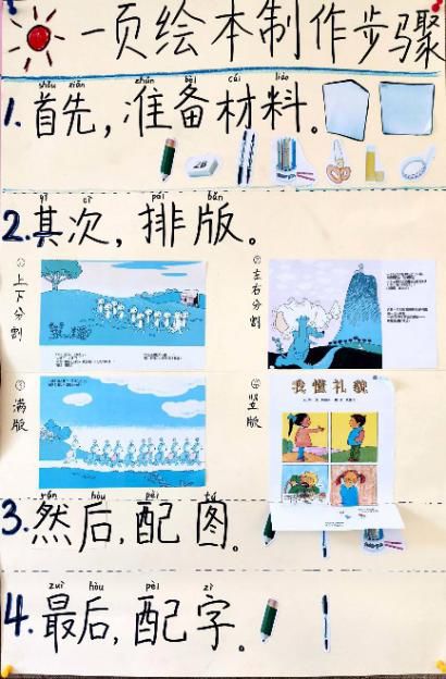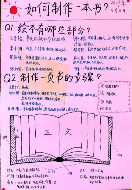 通过观察图书角里的绘本、欣赏同学在家制作的绘本,小土豆们了解了书的构成要素,对于自己的产品有了初步的概念,共同讨论出制作绘本的方法。