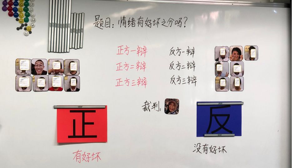达成一致后,在孩子们学完大部分的知识后,我们就把这个问题抛给了孩子们。“情绪有没有好坏?”小土豆们兵分两组,煞有介事开始了班级第一场正式的辩论。各方辩手相互用语言搏击,真理是越辩越明的,但我们这却并没有真理,只有观点,只享受观点搏击的快感。