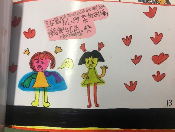 但小土豆们要想学会调节自己的情绪,第一步是要认识自己的情绪。如何认识自己的情绪呢?首先,自己在什么场景下,是(红黄蓝绿)色?为此小土豆们纷纷分享自己的生活经验和感受,并将这些场景和故事画了下来。