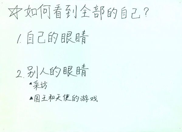 小土豆们通过采访同学、老师和家长,来认识“别人眼中的自己”。此外,我们还开启了“国王与天使”的游戏,在这个游戏中,国王不仅每天要暗中计划,对自己的天使说温暖的话,做温暖的事,还需要帮助国王找到他的亮点放在属于他的亮点收集罐里。
