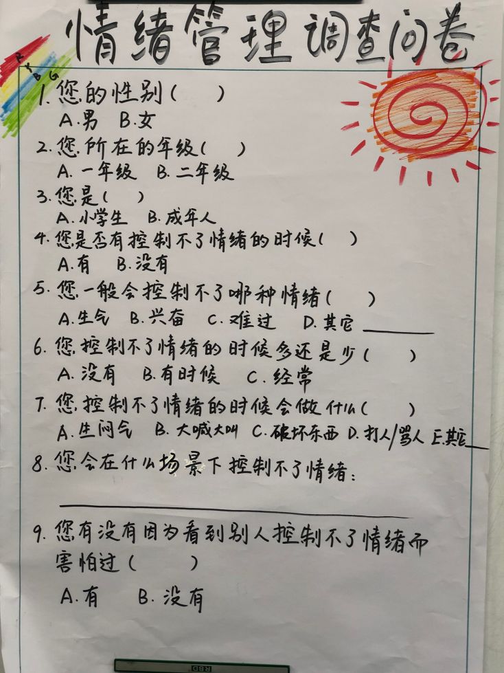 这些身边的例子就能够说明得了控制情绪是一件很难很让人头疼的事情吗?没有调查就没有发言权!最终,小土豆们决定调查一二年级的小朋友和老师有没有控制不了情绪的时候。于是,关于问卷调研的学习展开了。孩子们参考其它社会调查问卷共同讨论,创作出了属于自己的调查问卷,并对投放与回收的细节展开了几轮讨论,进而行动起来。