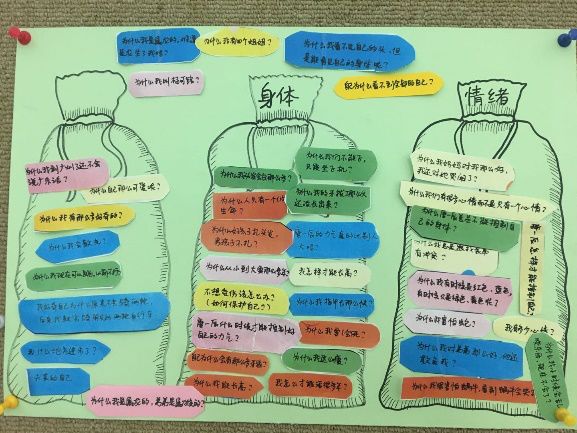 每一次的头脑风暴,小土豆们仿佛都要搞出十万个为什么方可罢休。这可能也是很多课堂上老师对于儿童发散性思维困扰的地方,甚至为此放弃了将选择权交还给孩子,又退守传统灌输式教学,仅仅跨个学科而已并不能称为真正的项目课。而在一土,老师们早有准备,我们带着孩子分小组通过think-pair-share的方式将这些小土豆们想要了解的自己分类整理成项目探究的三个部分:成长,身体,情绪。