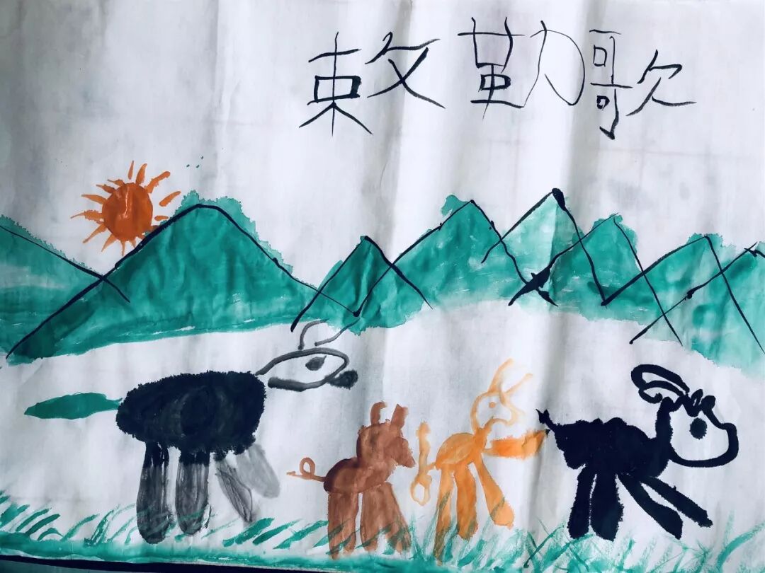 在画诗时涌现了很多疑问:“敕勒川什么意思?”“阴山是说天气很阴,有山的地方,还是一座山的名字?”“天似穹庐,穹庐是指火炉吗?”“天苍苍野茫茫到底怎么解释呢?”
