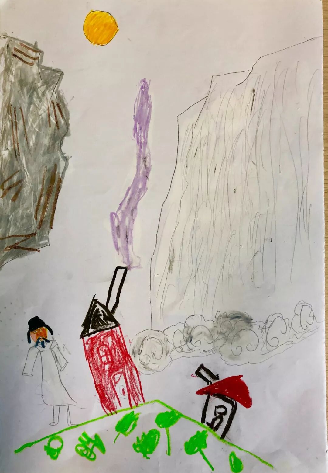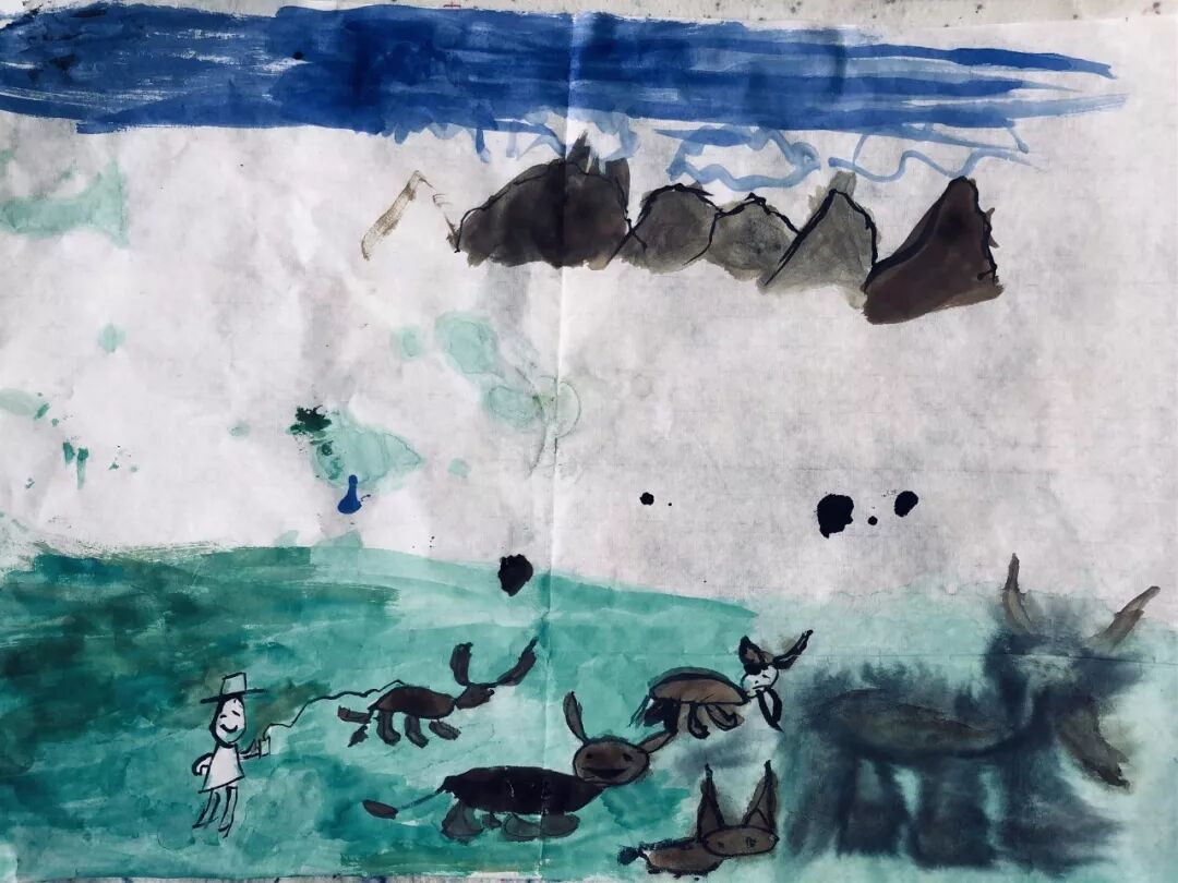 关于画中的《登鹳雀楼》,小土豆描述道:有黄河还有海,我们把鹳雀楼画得很高,因为诗中写了“欲穷千里目,更上一层楼”,我们觉得登得高才能看得远。