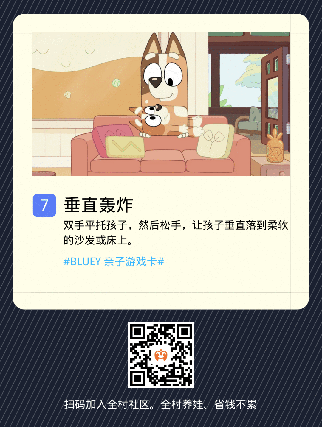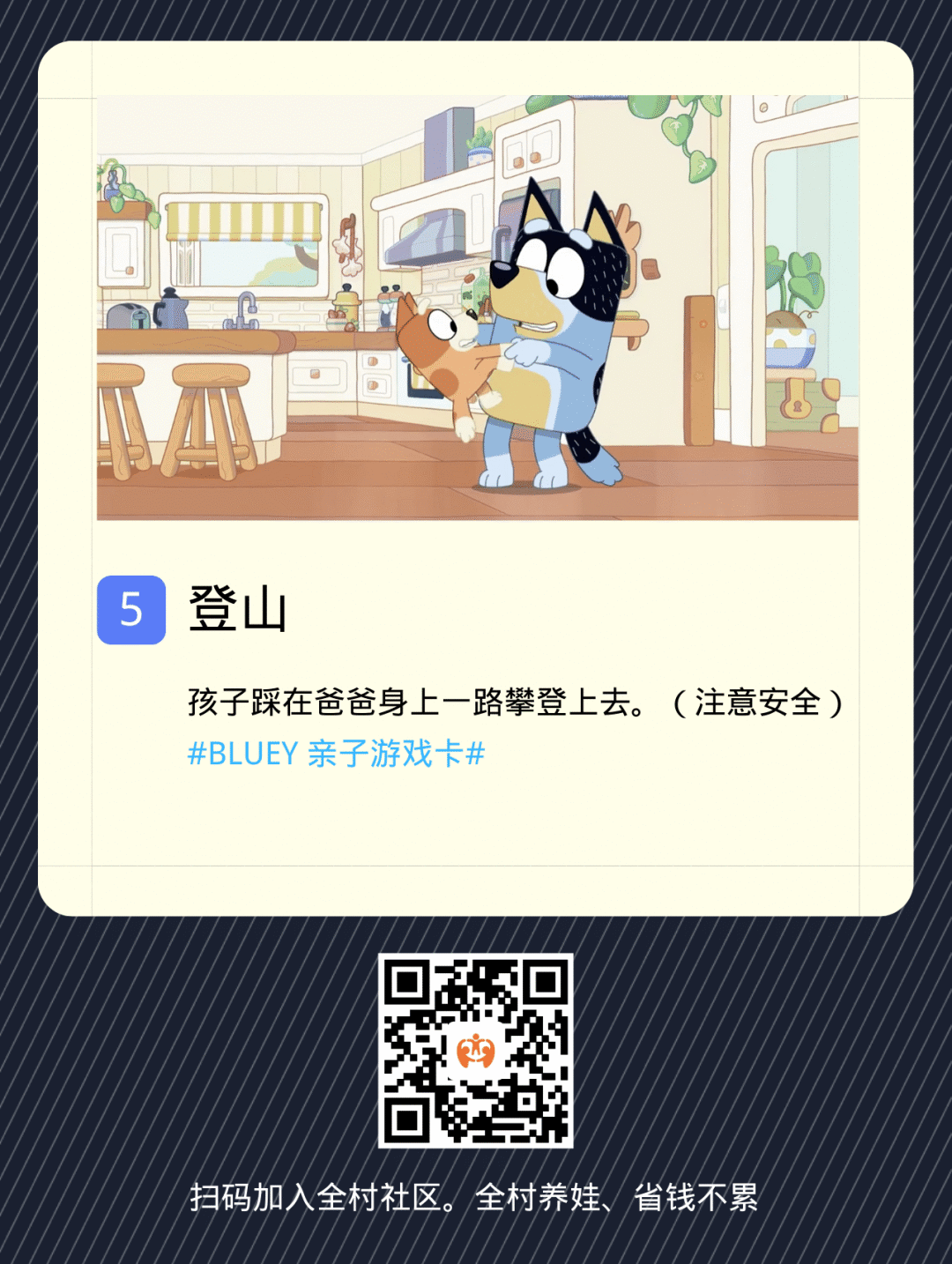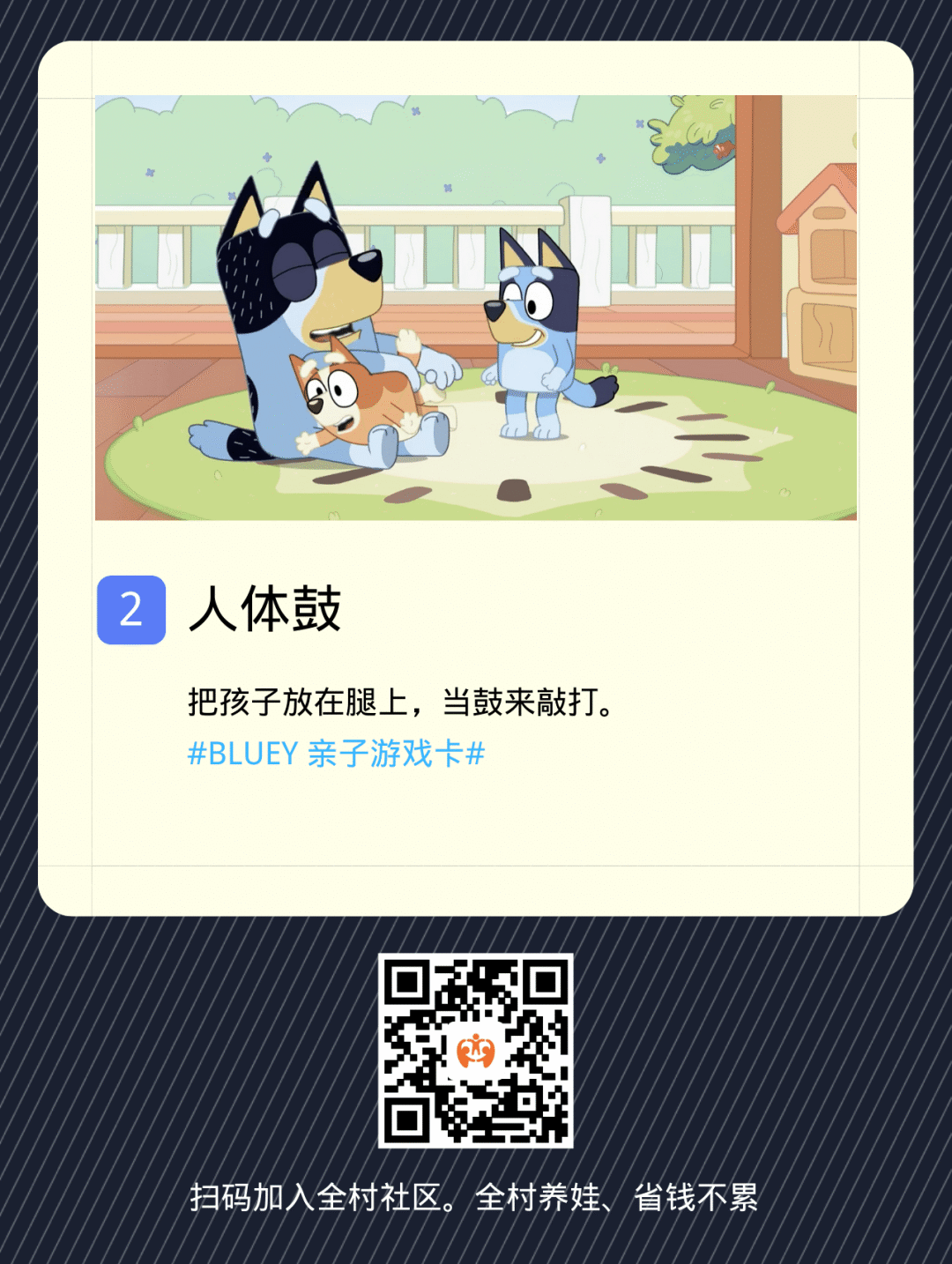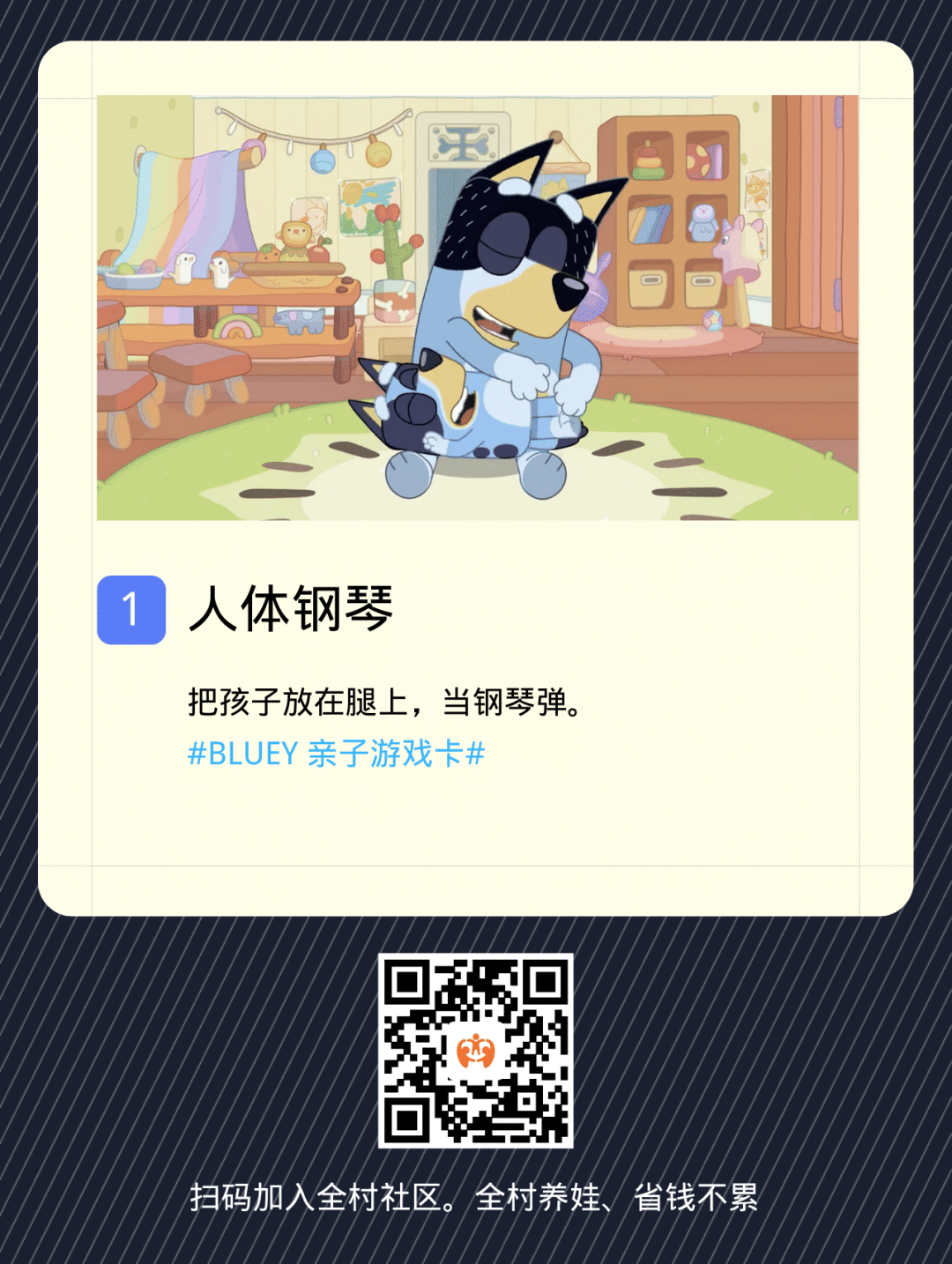 当时,我偶尔发现了一部超好看的动画片《布鲁伊》,里面竟然介绍了足足 30 多种亲子游戏。为了方便玩,我把它们做成了一套卡片,随时取用。结果是,孩子黏上了我这个“游戏王”。