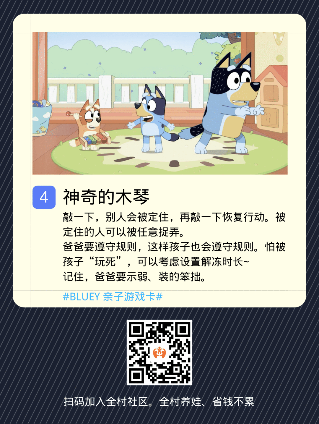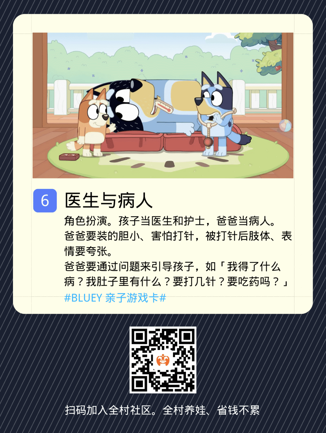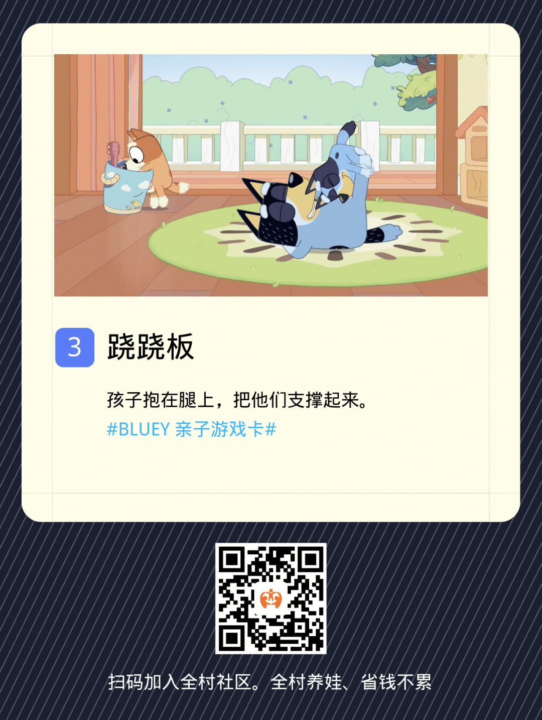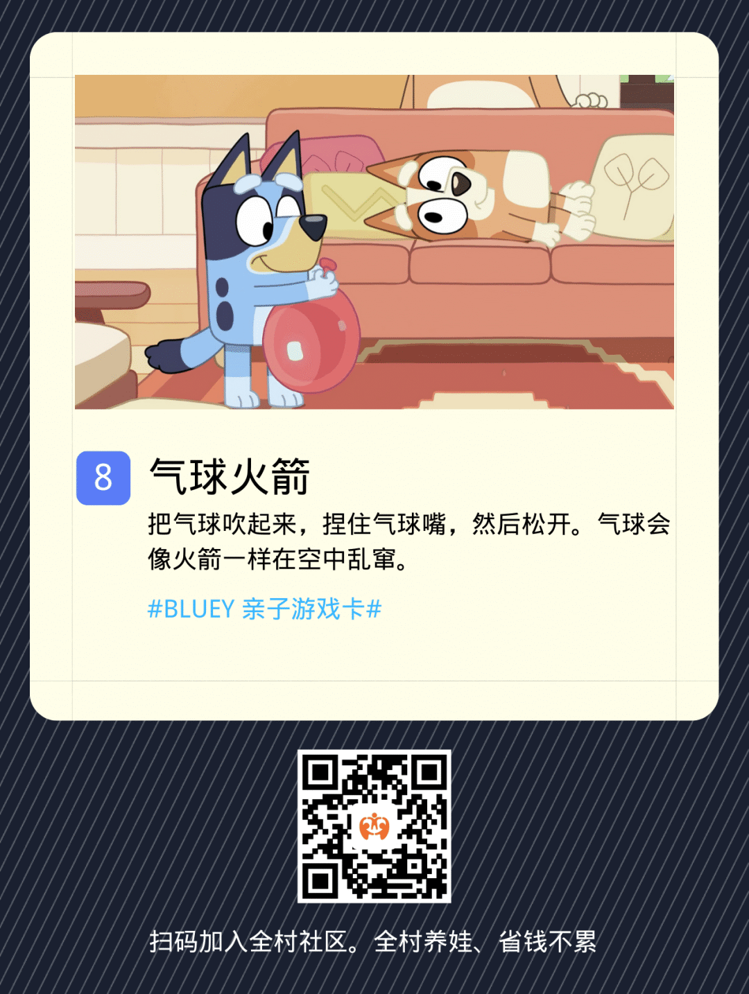 当时,我偶尔发现了一部超好看的动画片《布鲁伊》,里面竟然介绍了足足 30 多种亲子游戏。为了方便玩,我把它们做成了一套卡片,随时取用。结果是,孩子黏上了我这个“游戏王”。