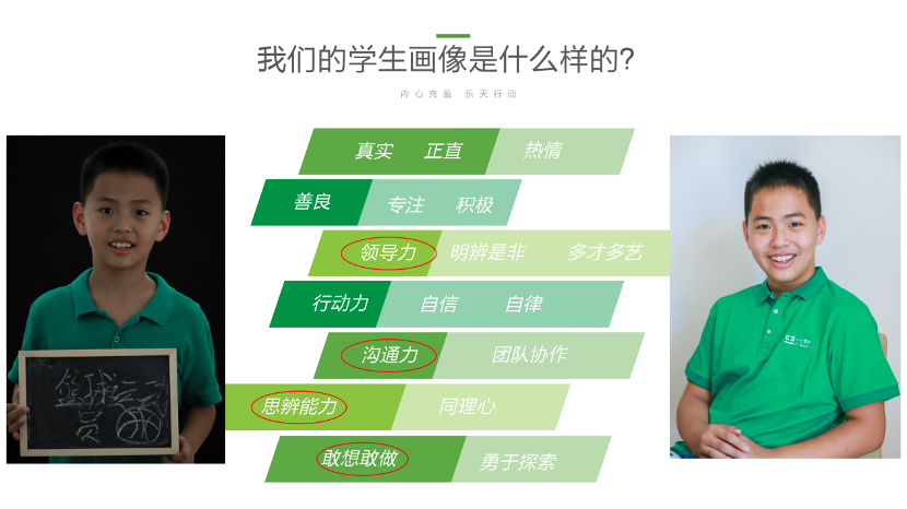 首先,一土有着自小学到中学,一以贯之的育人目标:内心充盈的乐天行动者,理性创新的高效学习者。这个目标是非常清晰的,这两行字也张贴在教室的醒目位置,时刻提醒着老师和学生,以此为目标开展所有教育教学工作。基于这个育人目标,我们也勾勒出了孩子的具体画像。这个画像本身,也充分体现了一土教育评价的核心:在对教育和孩子的评价越来越被窄化的当下,一土希望做的,是能够从更多的角度去看见孩子,并赋能每一个生动的个体。比如善良、正直;比如积极、自律;而在中学阶段,领导力、沟通力、思辨能力,对孩子来说显得更加重要。也正是这些看似“软”的技能,才是未来的人工智能时代最不可或缺的能力。