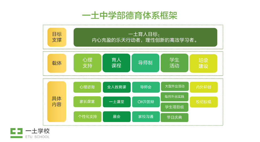 教育,拆开来讲,是教书和育人。而学校的德育,就是在践行“育人”的功能,也是真正指向教育本质的关键一环。当下许多学校的德育部门,主要承担的任务是对学生的思想道德建设和行为管理。而在一土,我们重新定义了德育,这里不仅包括了学生的行为管理,也包括了学生的个性化成长及育人课程,它是一套可以落地的育人体系。今天这篇文章来自一土高年级部的德育负责人李雅琪老师,希望和大家分享,在一土,我们如何重新定义德育。