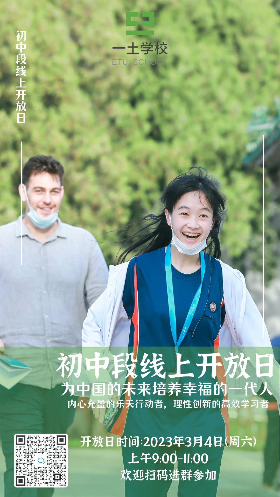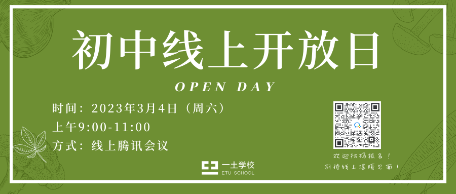 以上这些,就是我的一些思考和我们做过的一些实践。它一定不够完美,也一定还有改善的空间,我愿意怀着开放、接纳、感激的心态去接受批评意见。但我想强调的依旧是冰山下的那部分,在一土,我们强调全员德育,所有老师都要看重孩子们冰山下的成长,我们希望做回归本质的教育。面对未来我也还有很多设想,希望有机会能再和大家分享,也希望您关注一土公众号,参与我们的开放日活动,现场和您分享更多关于我和一土正在发生的故事。欢迎您扫描海报二维码,预约3月4日周六上午9:00-11:00,一土高年级部线上开放日~