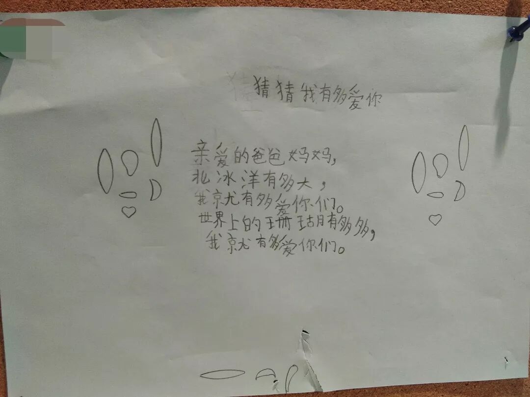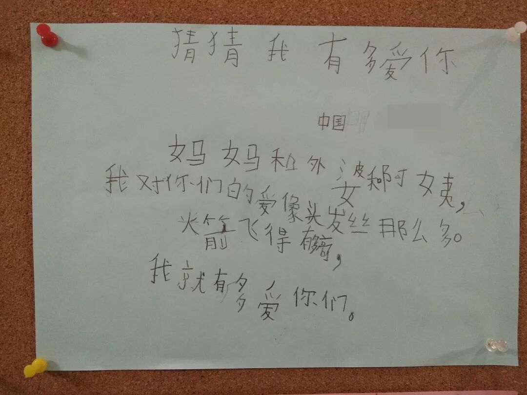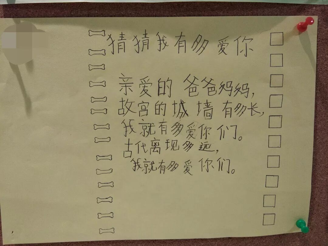 “亲爱的爸爸妈妈,故宫的城墙有多长,我就有多爱你们。古代离现(在)多远,我就有多爱你们。”