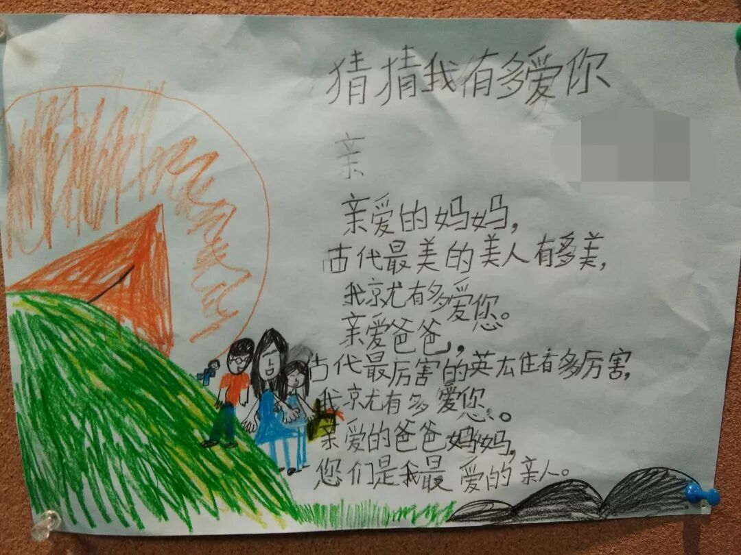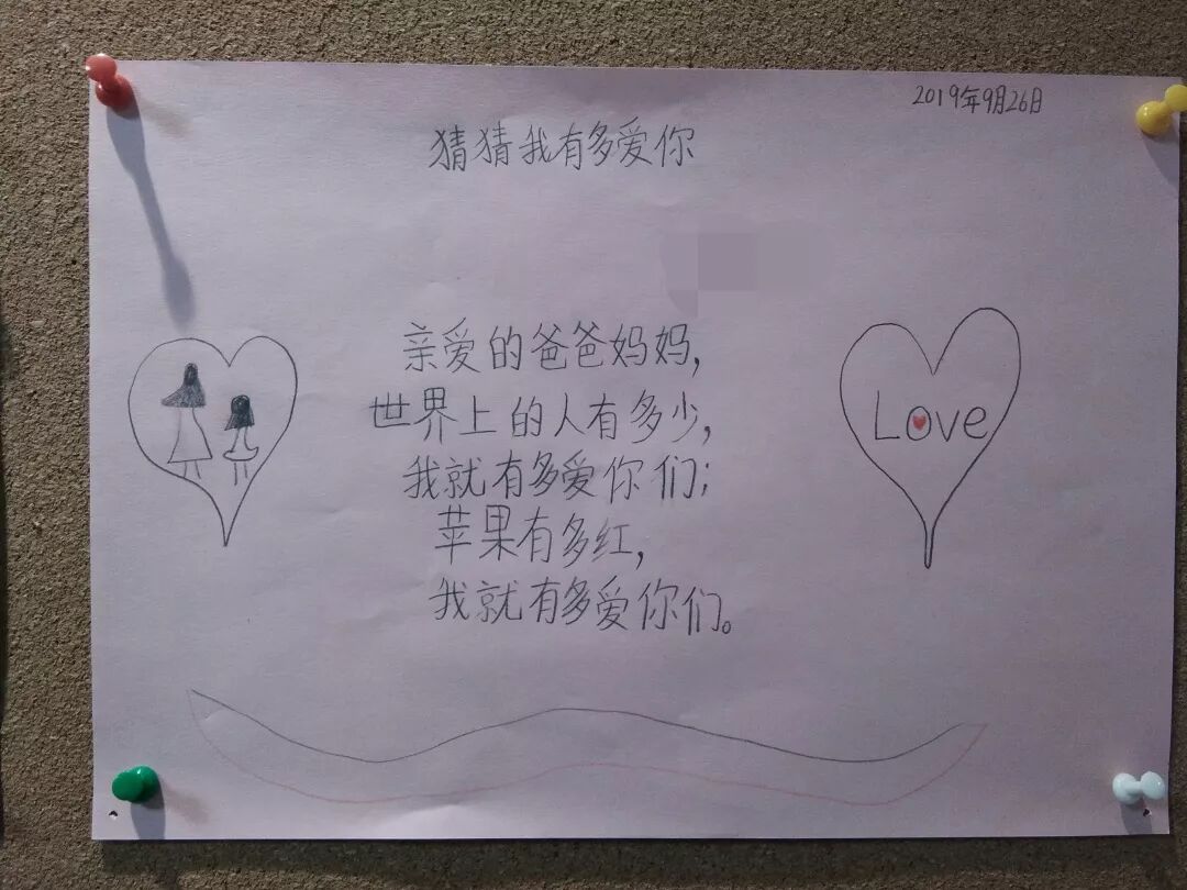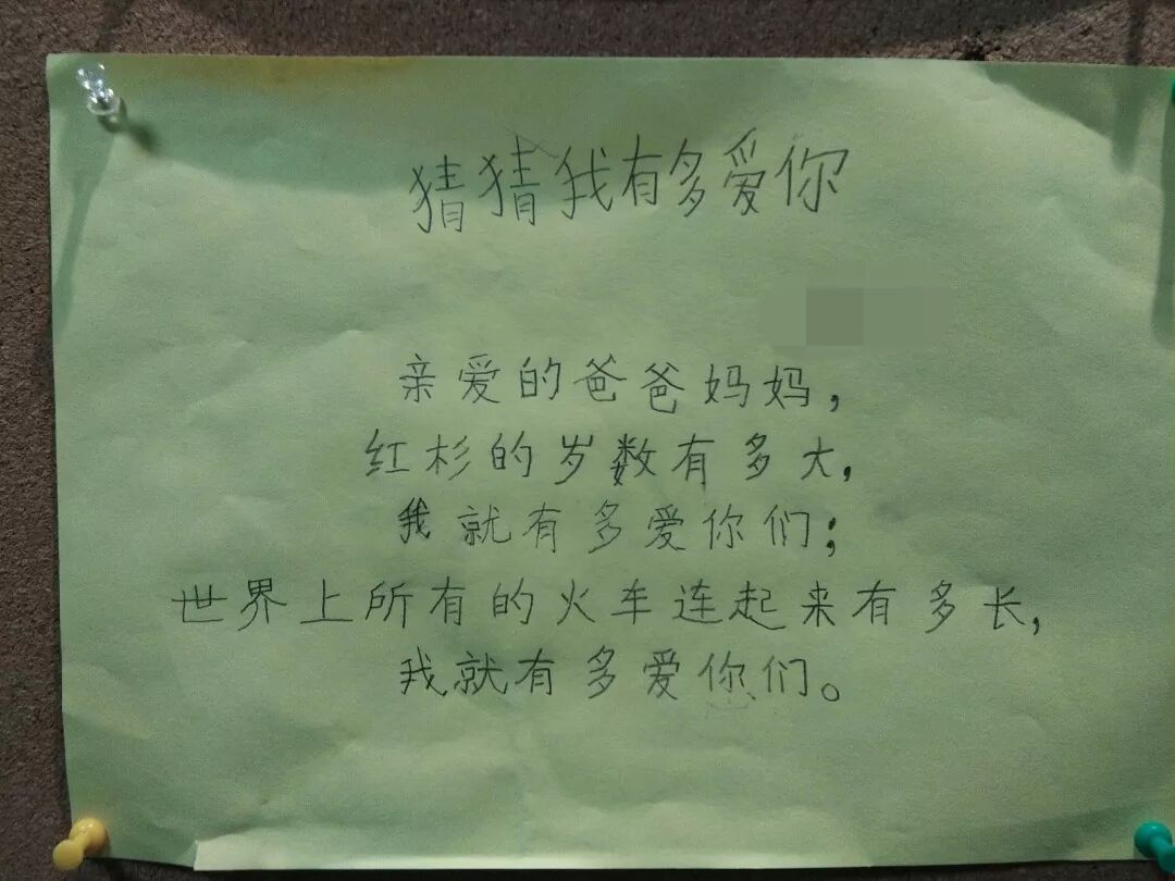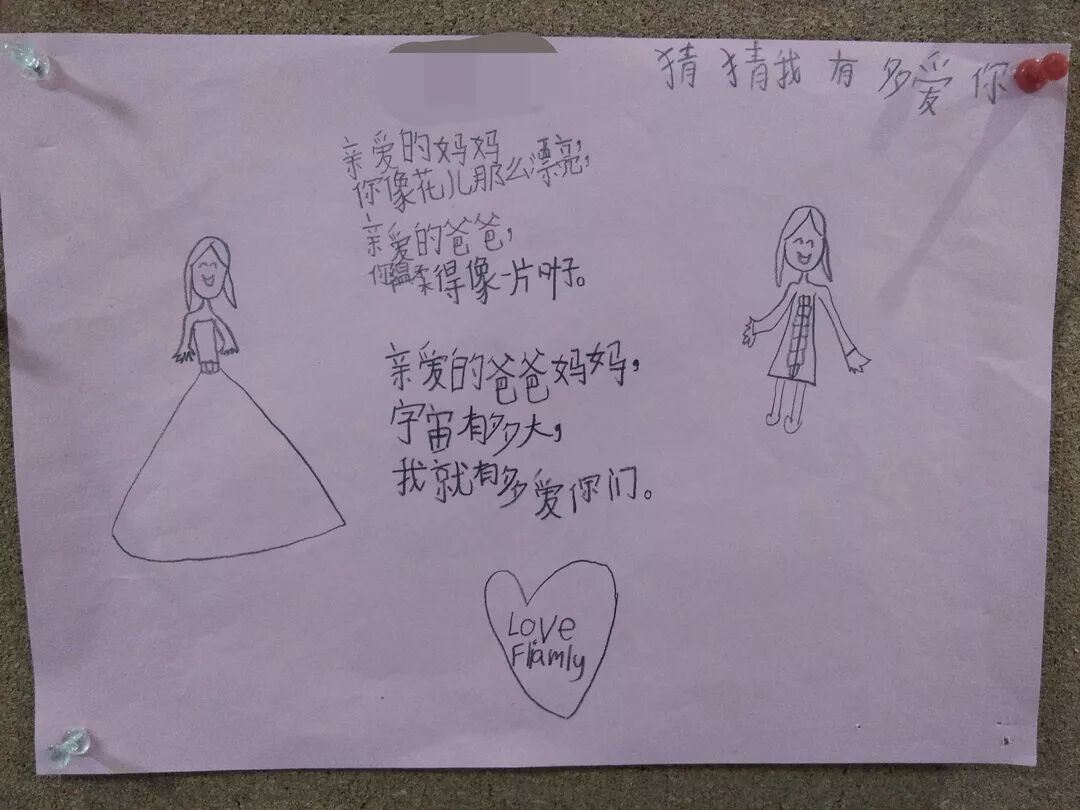 “亲爱的爸爸妈妈,世界上的人有多少,我就有多爱你们;苹果有多红,我就有多爱你们。”