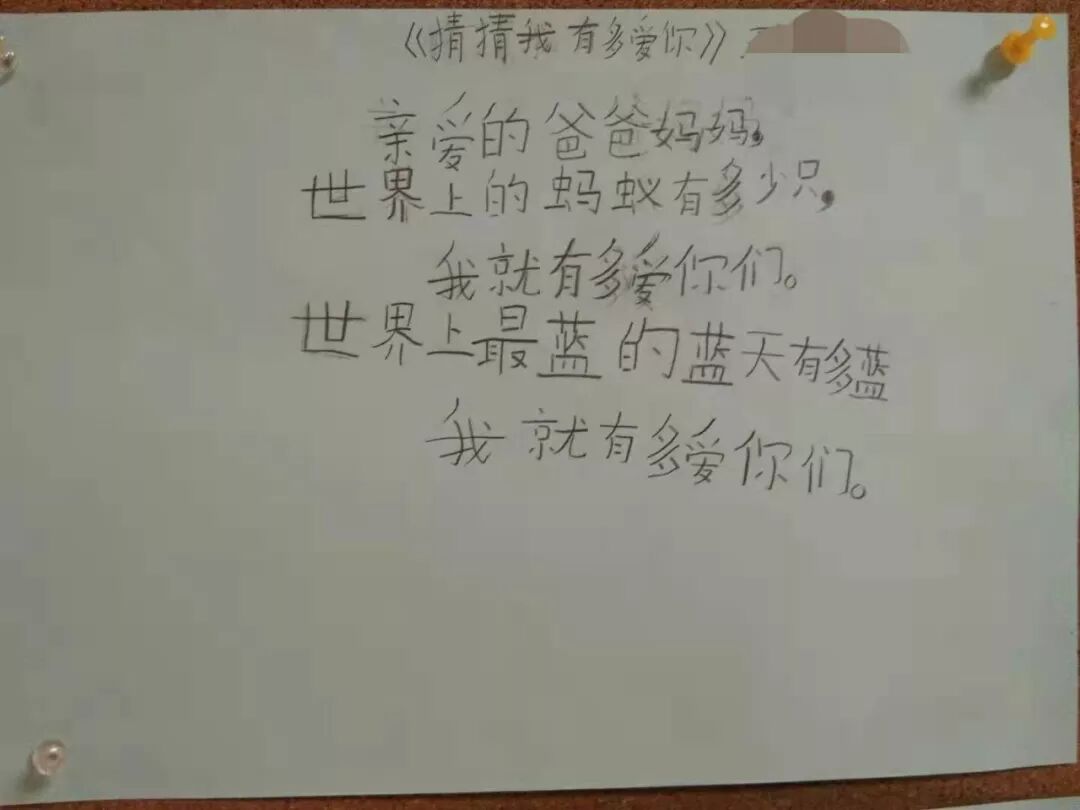 “亲爱的爸爸妈妈,世界上的蚂蚁有多少只,我就有多爱你们。世界上最蓝的蓝天有多蓝,我就有多爱你们。”