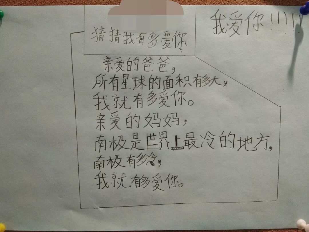 “亲爱的爸爸,所有星球的面积有多大,我就有多爱你。亲爱的妈妈,南极有多冷,我就有多爱你。”