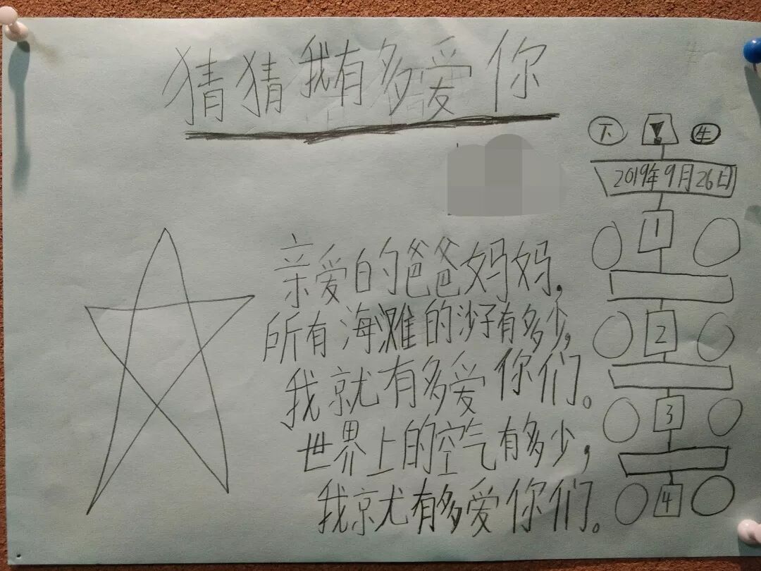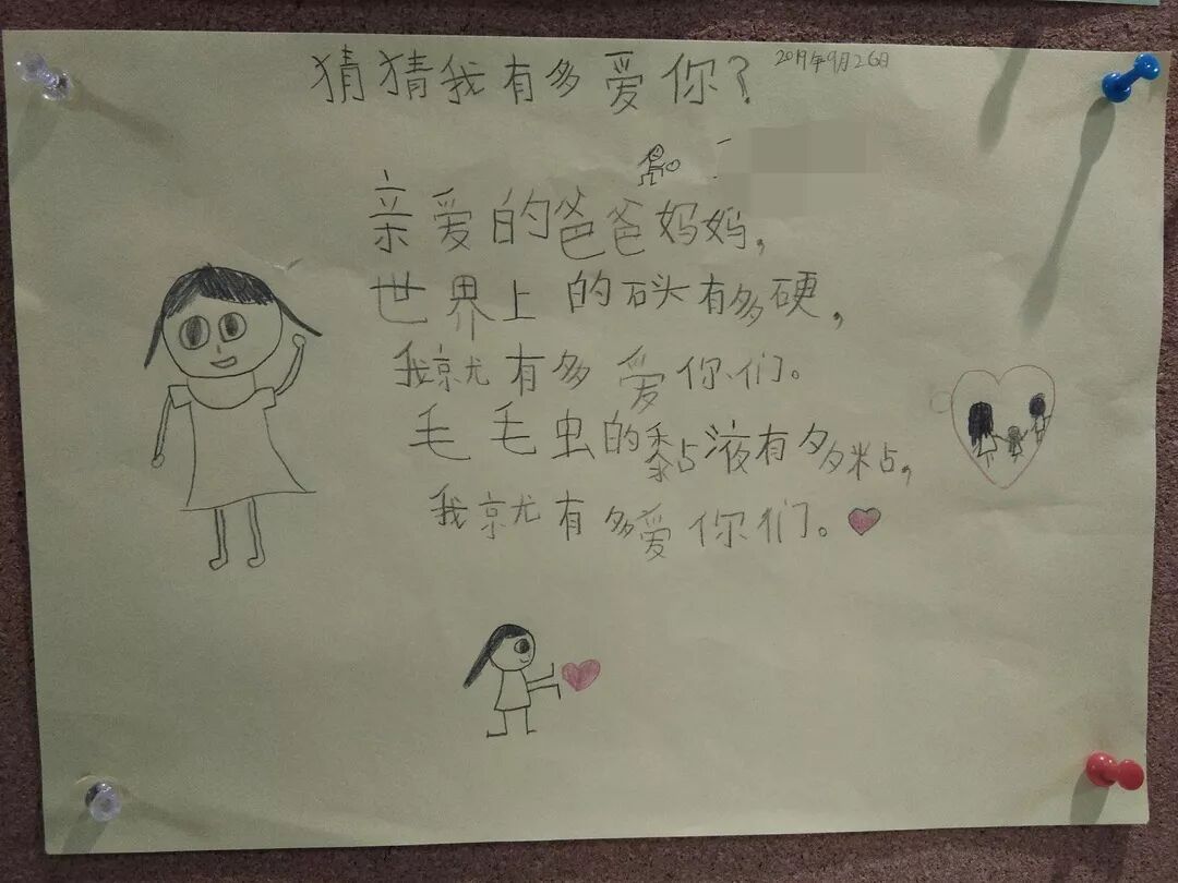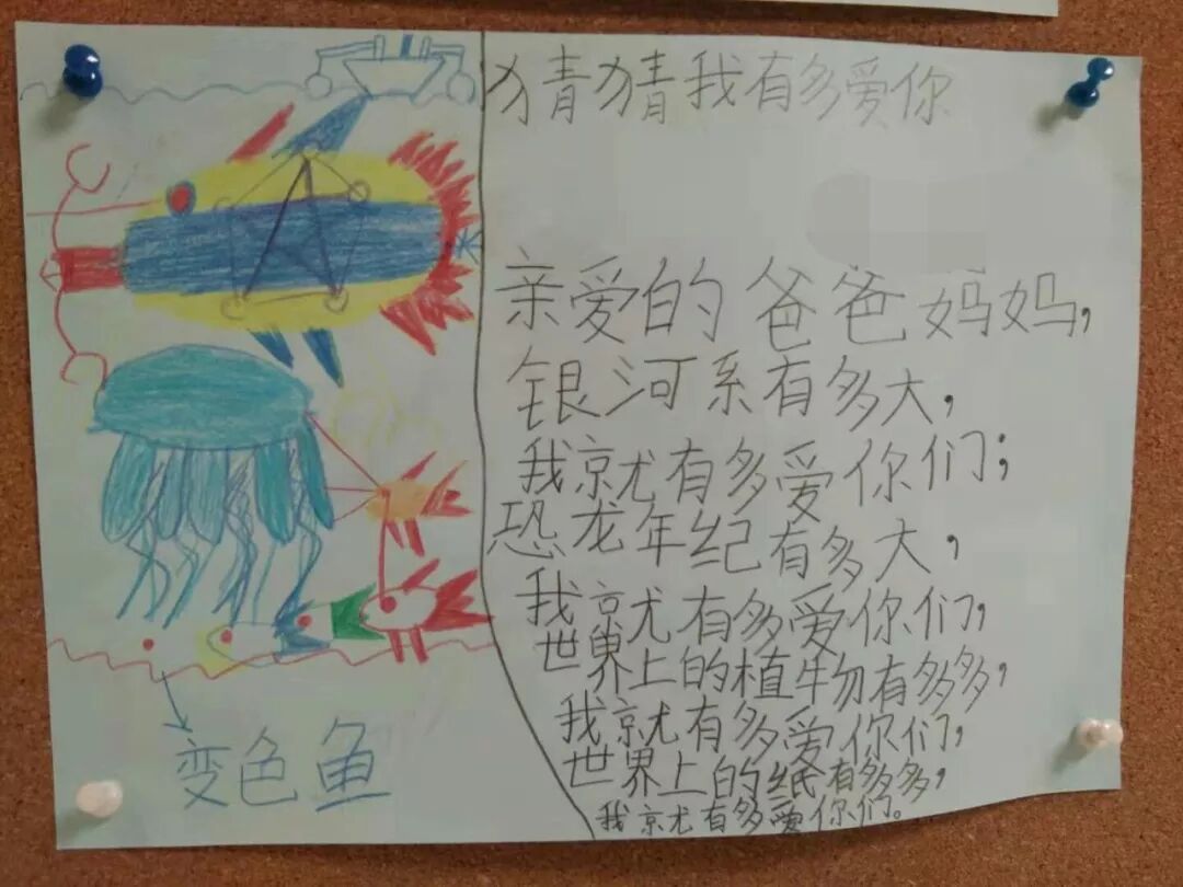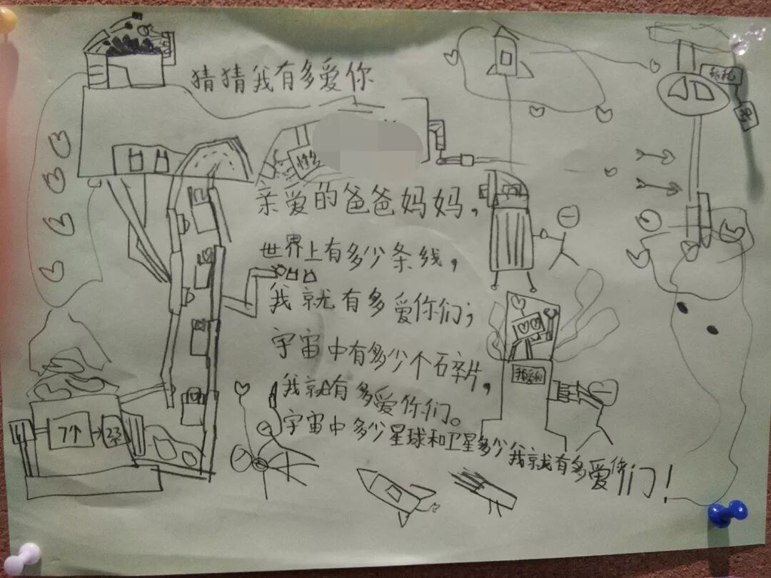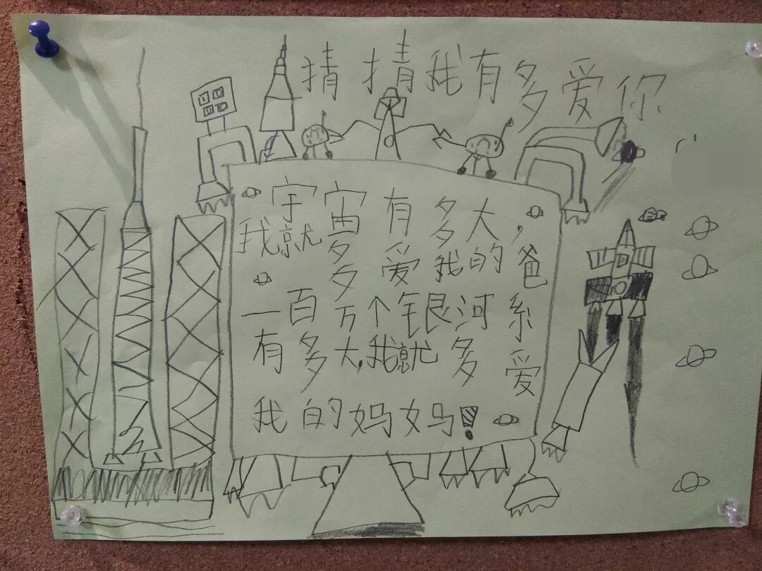 “亲爱的爸爸妈妈,银河系有多大,我就有多爱你们;恐龙年纪有多大,我就有多爱你们……”