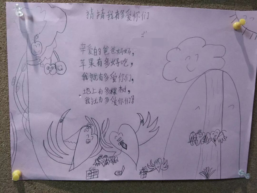“亲爱的爸爸妈妈,苹果有多好吃,我就有多爱你们;地上有多(少)棵树,我就有多爱你们。”
