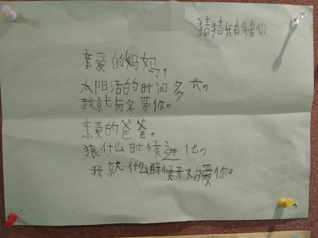“亲爱的妈妈,太阳活的时间多长,我就有多爱你。亲爱的爸爸,狼什么时候进化,我就什么时候开始爱你。”