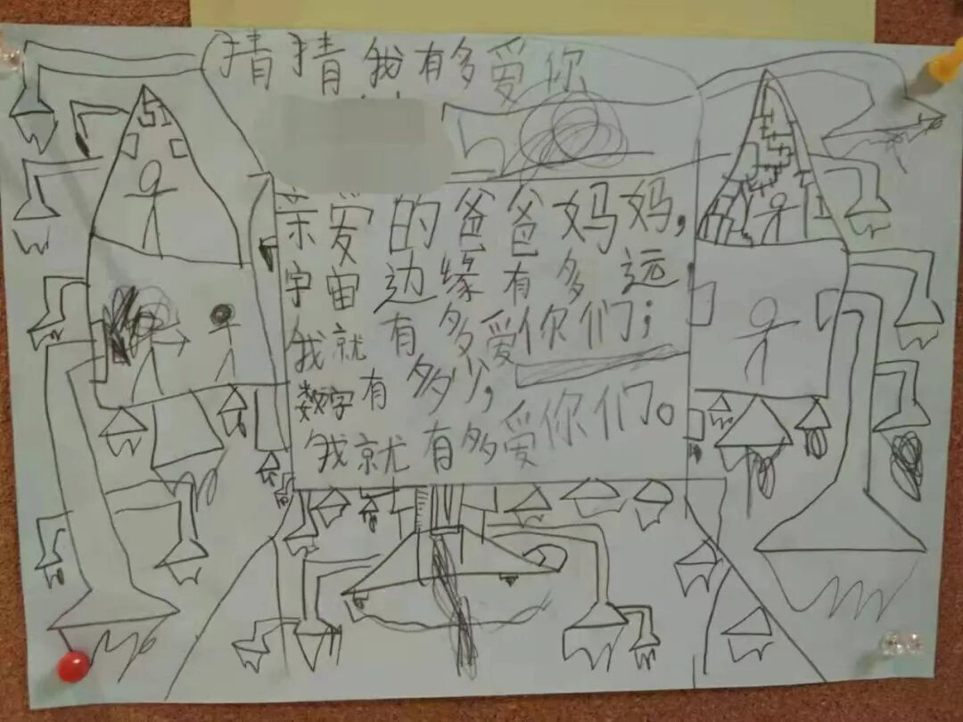 “亲爱的爸爸妈妈,世界上有多少条线,我就有多爱你们。宇宙中有多少个碎片,我就有多爱你们。宇宙中(有)多少星球和卫星我就有多爱你们!”