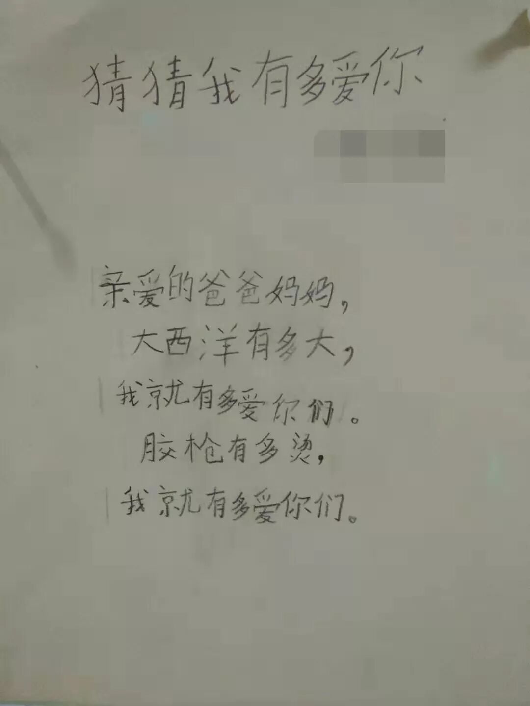 “亲爱的爸爸妈妈,大西洋有多大,我就有多爱你们。胶枪有多烫,我就有多爱你们。”