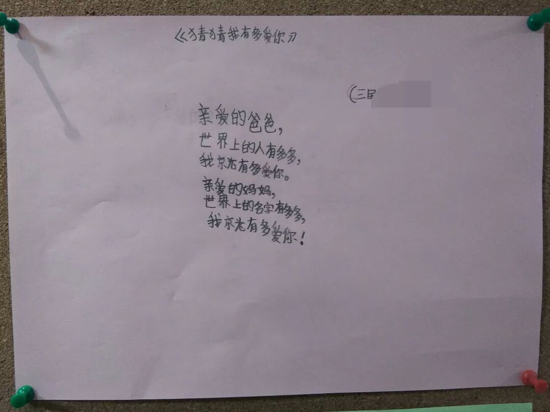 “亲爱的爸爸,世界上的人有多多(少),我就有多爱你;亲爱的妈妈,世界上的名字有多多(少),我就有多爱你。”